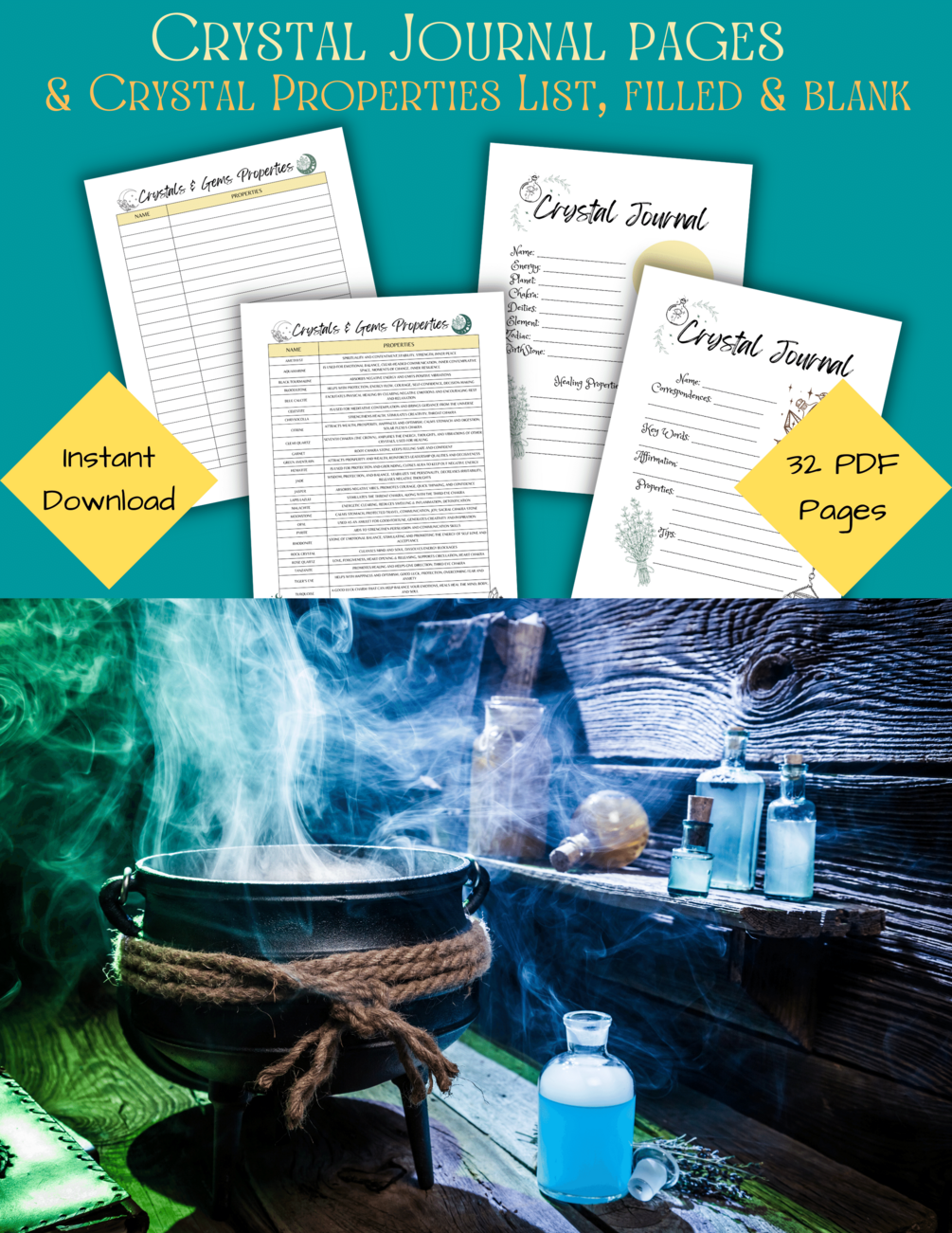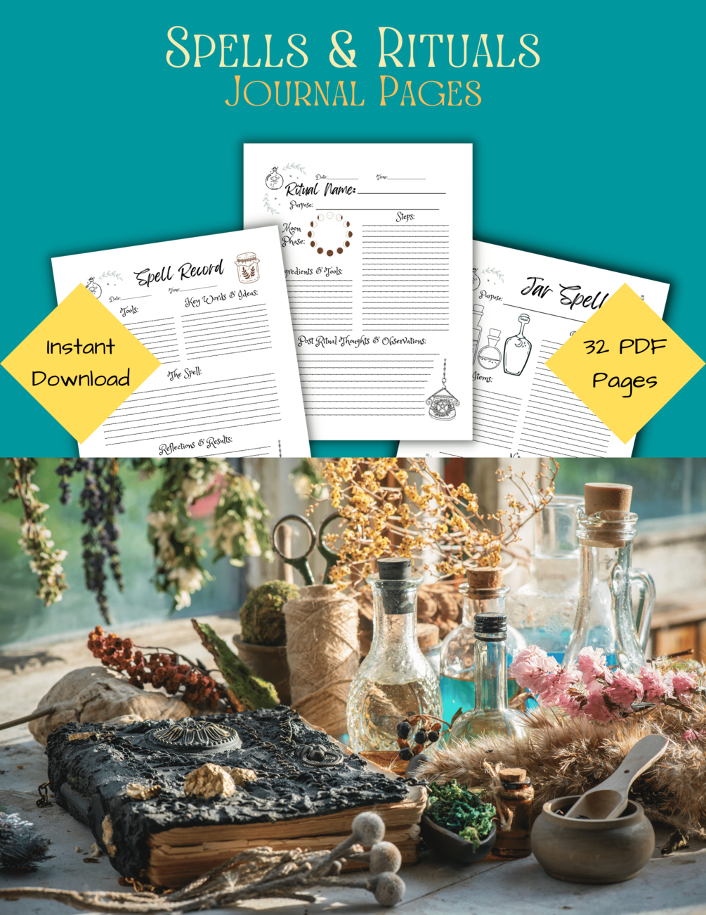 This printable witchy planner includes 32 grimoire pages: